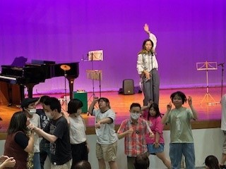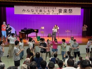 たくさんの来場者の中、名古屋芸術大学音楽療法グループマイエさんによる素敵な音楽のスタートからみんなノリノリで前に出て踊ったり、大きな声で歌ったり、イスを大きく揺らしながら体全体で音楽を感じたりとそれぞれ思い思いに楽しんでいました。